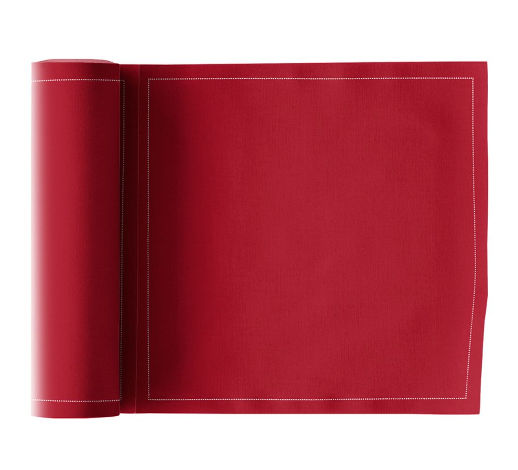 Napkins for events 20×20 cm in lipstick red and 100% cotton, presented in roll of 25 units. Perfect for accompanying coffee breaks, cocktails and aperitifs, lunches and other celebrations. A shade of colour to dress the table.