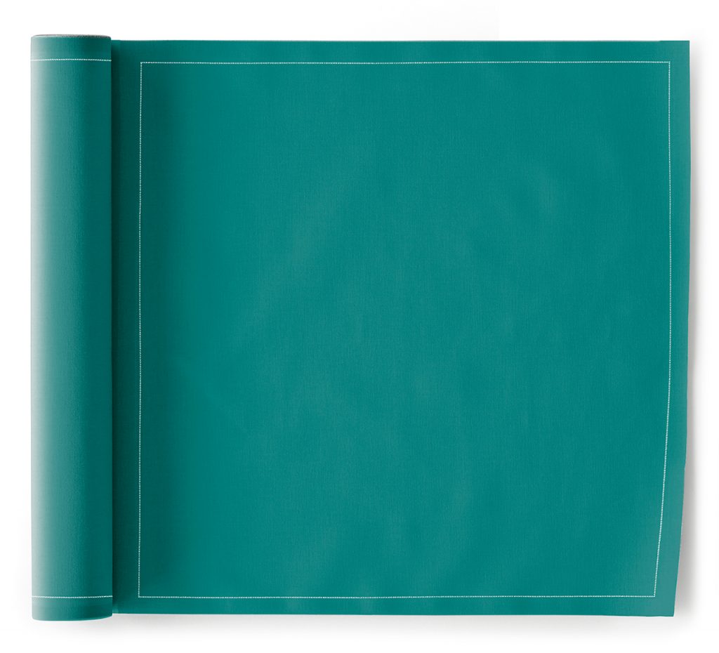 Servilletas de mesa 32×32 cm en verde Caribe y 100% algodón, presentadas en rollo de 12 unidades. Perfectas para acompañar todo tipo de celebraciones y comidas formales. Un color único para vestir la mesa con estilo.