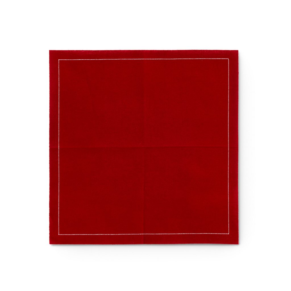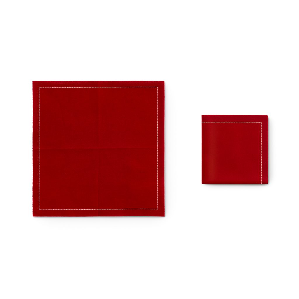 Serviettes de table en tissu de 20 x 20 cm pliées, idéales pour accompagner des pauses-café, des cocktails ou des lunchs à l’occasion d’événements d’entreprises et de célébrations spéciales. La couleur rouge carmin donne du caractère et de la personnalité à la table.